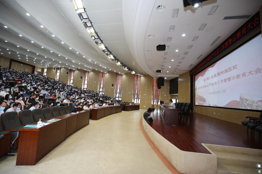 6月11日下午,校(院)及直属附属医院2020年全面从严治党工作暨警示教育大会在含浦校区第三教学楼学术报告厅召开。省纪委省监委驻省教育厅纪检监察组副组长刘爱军,全体校(院)领导,校(院)纪委委员、处级干部、纪检监察干部、特约监察员,各二级单位职工党支部书记,直属附属医院党支部书记、科级干部、临床科室主任、护士长、纪委委员、纪检监察干部等参与本次会议。